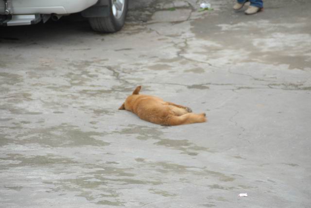 在去农家乐的公路上,看到这条叫阿黄的狗。开始我们还以为它遭碾死了,谁知它是在公路中间晒太阳——能够站在公路中间这么横,比雅安交警可牛多了。:lol